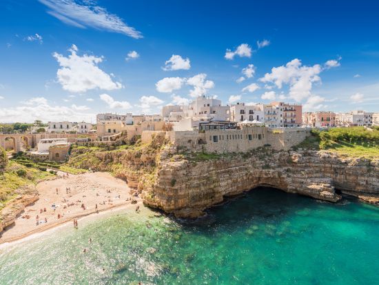 5° GIORNO Prima colazione in hotel. Intera giornata libera oppure si consiglia l’escursione guidata e giornaliera a Monopoli e Polignano a Mare (facoltativa circa € 60,00). Al mattino partenza per Monopoli, la città dalle cento Contrade e tempo dedicato alla visita del suo centro storico caratterizzato da piccole piazze, la Basilica Cattedrale, le chiese di S. Maria Amalfitana, S. Domenico e S. Pietro che si snodano in un labirinto di case. Sul porto si erge il Castello di Carlo V, intorno al quale resta viva l’arte di alcuni artigiani di costruire barche. Tempo libero a disposizione anche per fare acquisti di prodotti tipici quali le orecchiette, i latticini, le burrate etc. Pranzo libero. Proseguimento per Polignano a Mare antico borgo rurale marinaro che ha dato i natali a Domenico Modugno. Visiteremo il centro storico con la Chiesa di Matrice, la Chiesa di Sant’Antonio e il bel lungomare con la Statua dedicata al cantante Modugno. Tempo libero per passeggiare liberamente o per fare un bagno nelle limpide acque del mar Adriatico. Al termine rientro in hotel, cena e pernottamento.